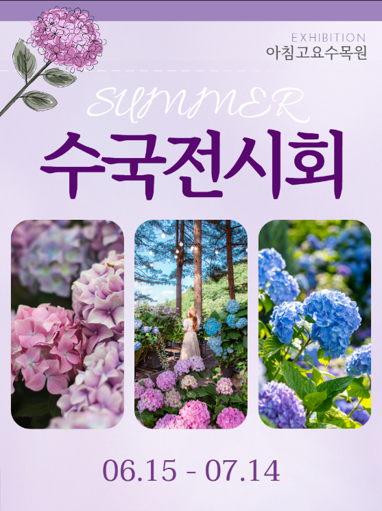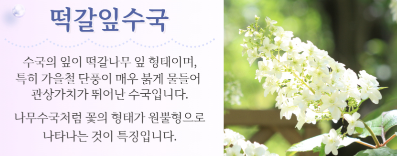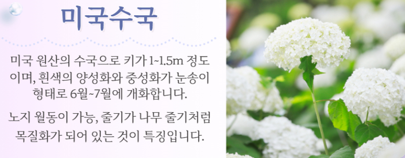 - 넓은잎수국, 미국수국, 떡갈잎수국, 산수국 등 약 200여점을 전시합니다.