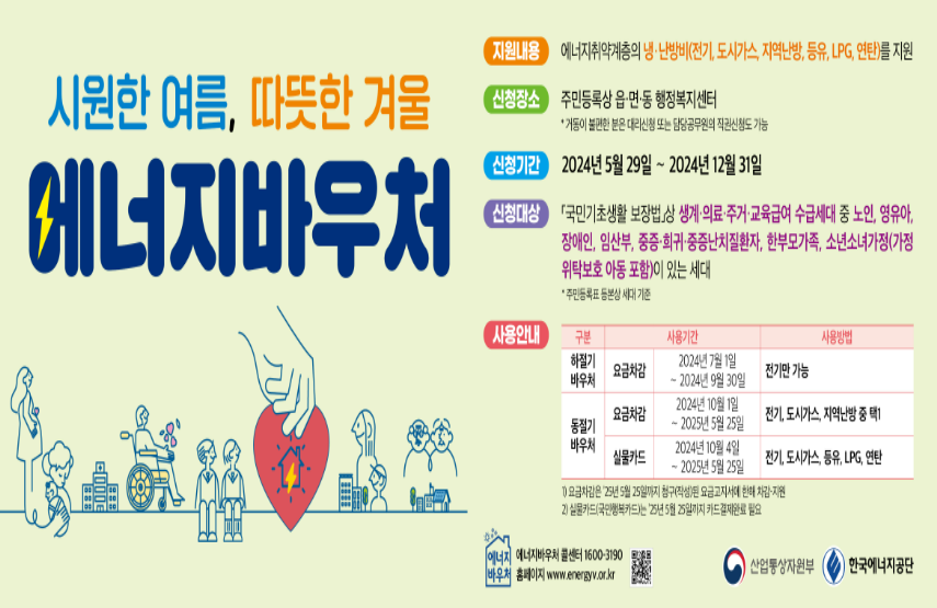취약계층을 대상으로 에너지비용을 지원해주는 에너지바우처 사업이 24년 5월 29일(수) 부터 12월 31일(화)까지 진행됩니다. 에너지 바우처는 취약계층의 걱정 없는 여름·겨울나기를 돕기 위해 냉·난방 이용에 필요한 에너지를 구입할 수 있는 이용권(바우처)를 지원하는 사업으로 전국 읍· 면 · 동 행정복지센터와 복지로 홈페이지에서 신청 · 접수를 진행합니다.