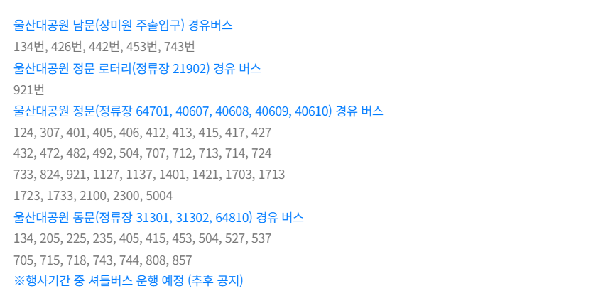 울산대공원 남문(장미원 주출입구) 경유버스 134번, 426번, 442번, 453번, 743번 울산대공원 정문 로터리(정류장 21902) 경유 버스 921번 울산대공원 정문(정류장 64701, 40607, 40608, 40609, 40610) 경유 버스 124,